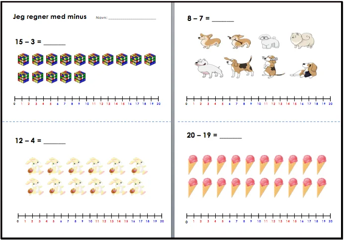 I dette blogginnlegget vil jeg dele en av oppgavene vi brukte da vi jobbet med repetisjon av regnestrategier i subtraksjon. Dette oppgavesettet består av fire sider, og på hver side er det oppgaver knyttet til en regnestrategi i subtraksjon: “telle nedover”-strategien, “finne differansen/forskjellen”, “halvering” og “tiere og enere”. Jeg har ikke tatt med “tiervenner”. Denne regnestrategien hadde vi allerede repetert.