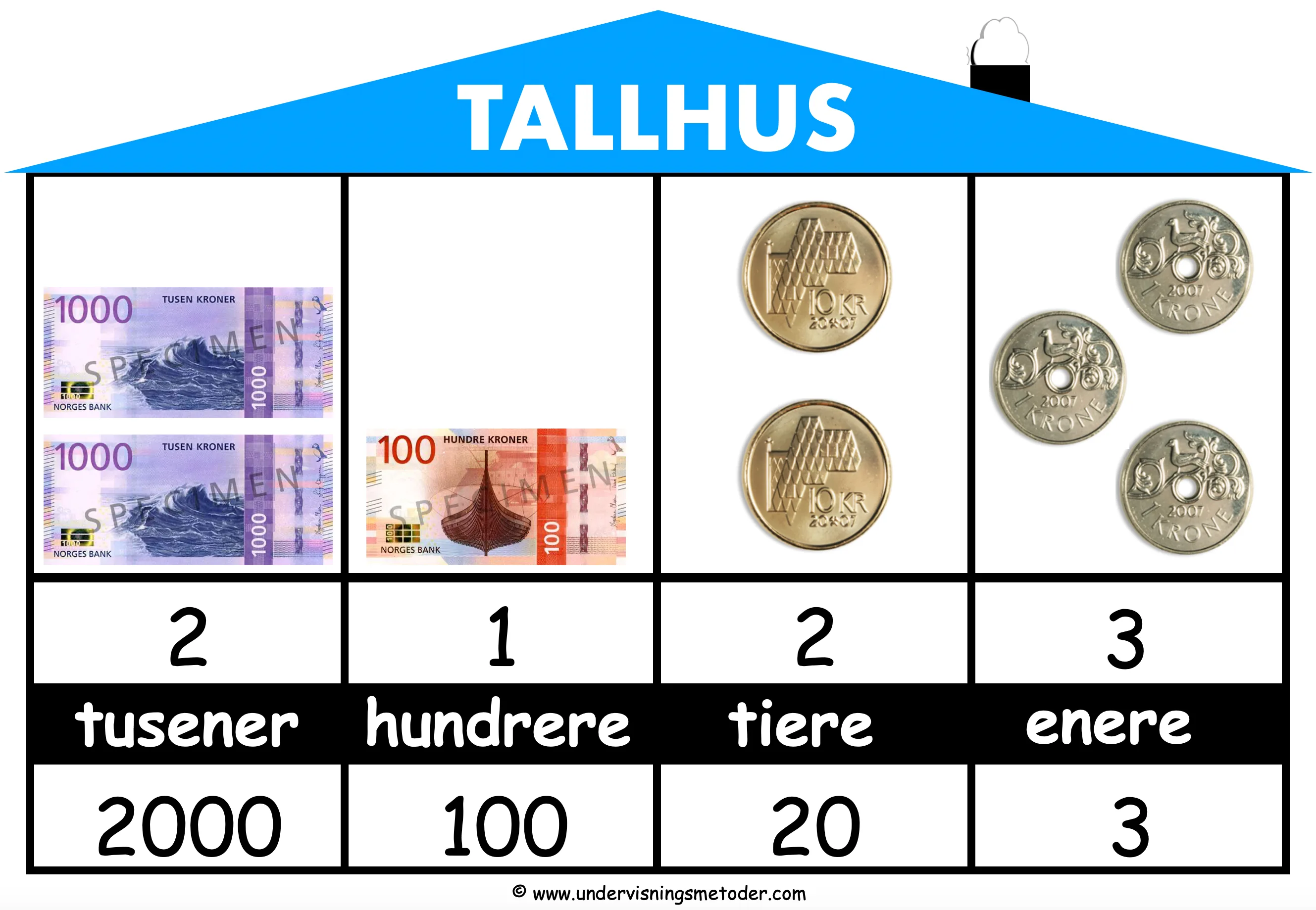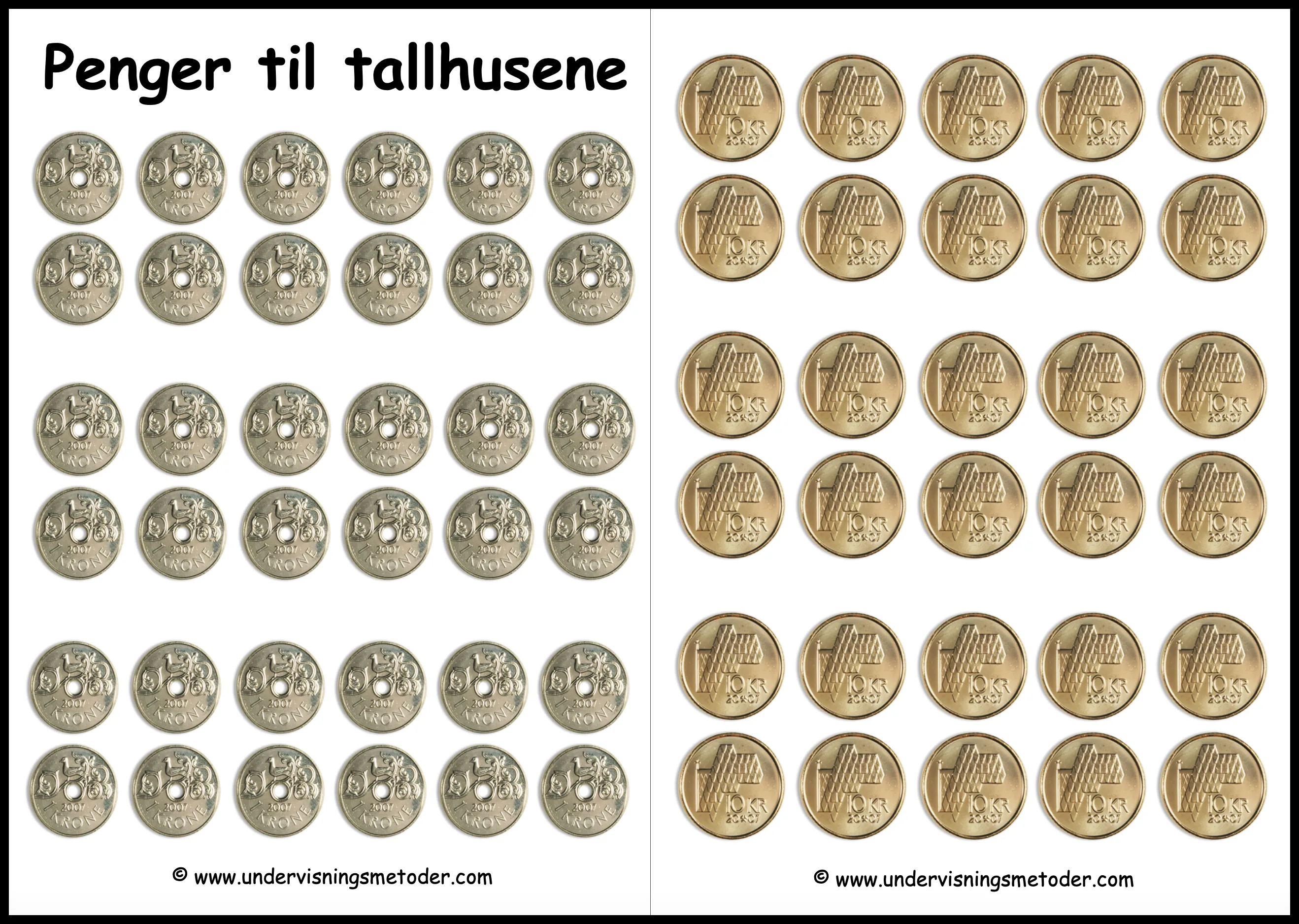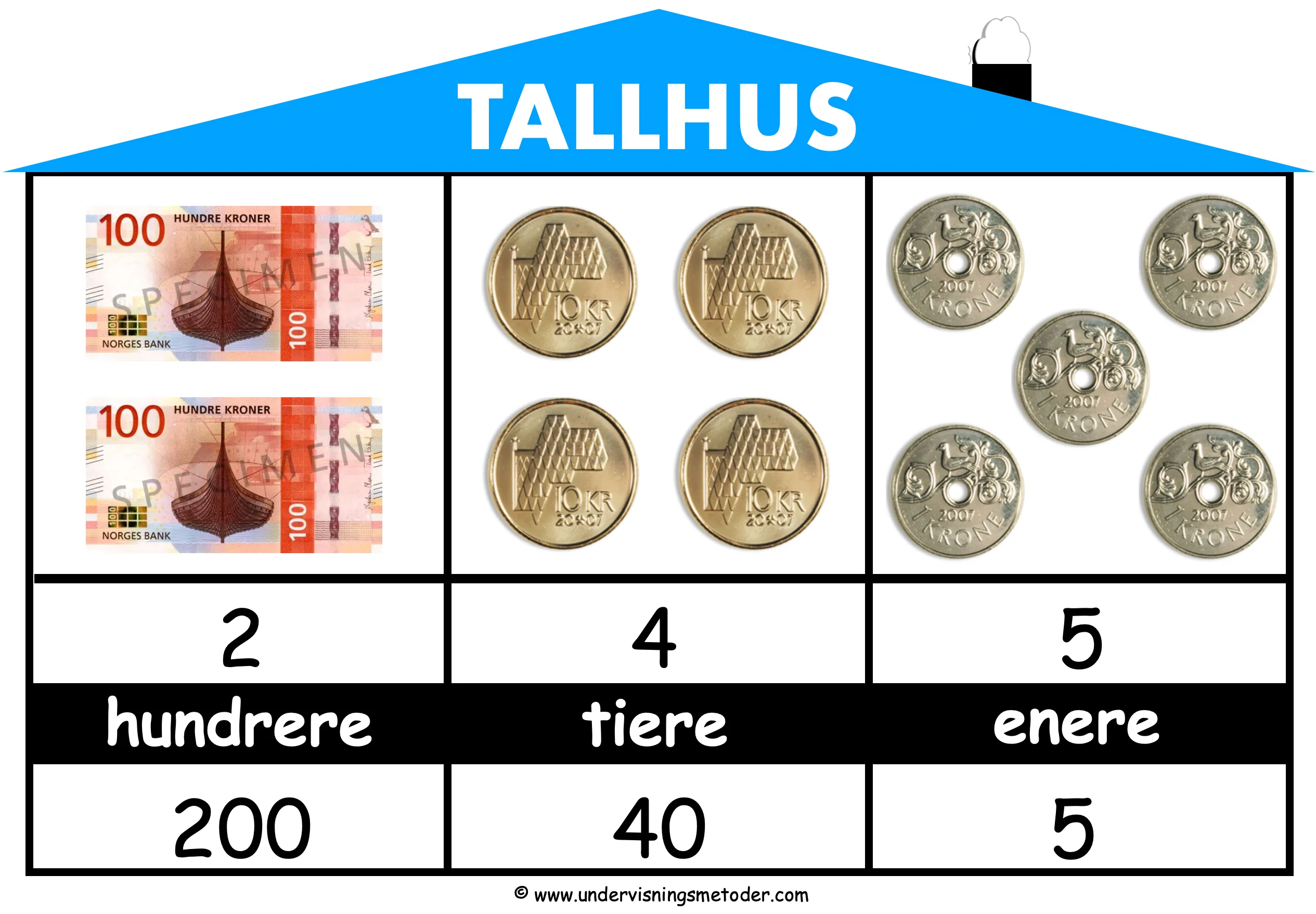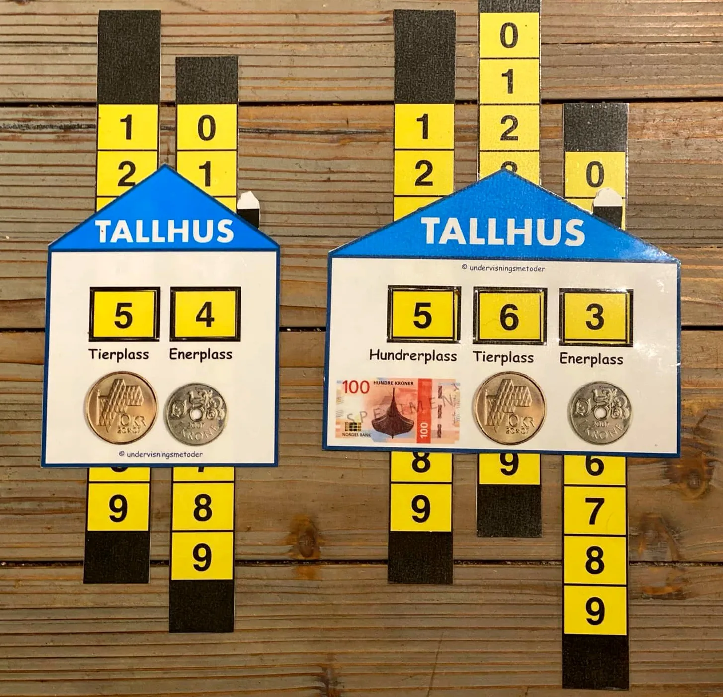 Jeg må legge til at det “standard” tallhuset, der du skriver tallet, for så å legge penger på, også er med. Det er fire ulike versjoner, så er det opp til deg å velge hvilken som passer. De kan selvfølgelig også brukes på uteskole, bare at man da bruker naturmaterialer til å lage mengden med.