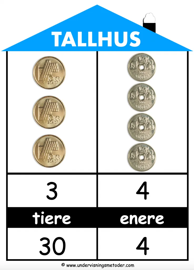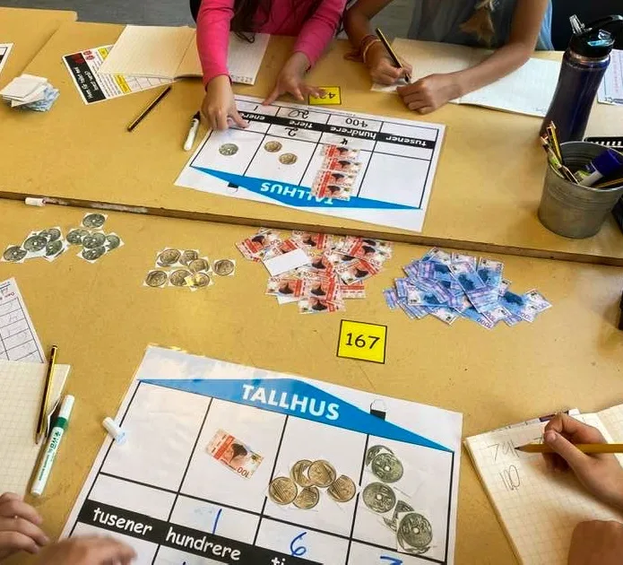 - Hvert læringspar skriver tallet i tallhuset (med tusj). Deretter samarbeider de om å lage tallet med penger. Når de har gjort det, samarbeider de om å skrive verdien til hvert siffer under, altså tallet på utvidet form.
