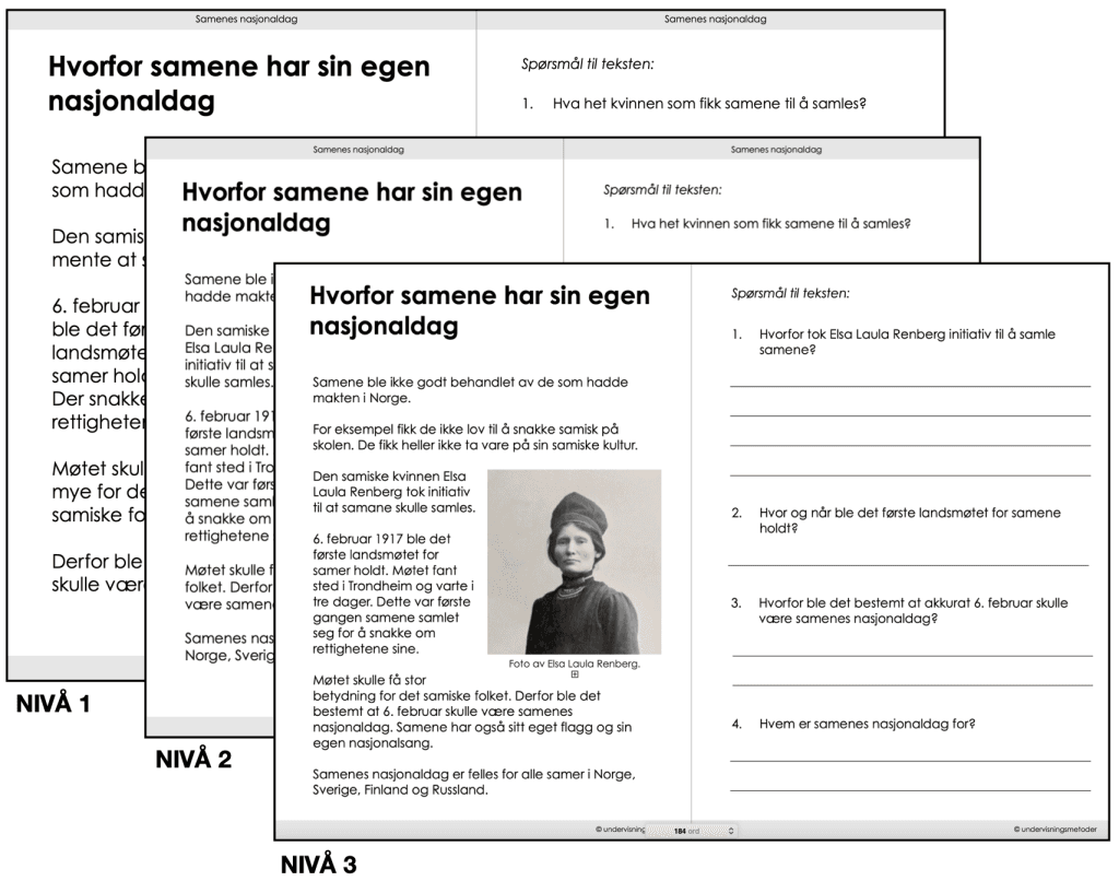 Et grunnleggende spørsmål er nettopp hvorfor samene har sin egen nasjonaldag. Bakgrunnen for denne dagen kan dere lese om i teksten “Hvorfor samene har sin egen nasjonaldag”. Den har tre nivå, og til hver tekst er det tilhørende spørsmål. Tekstene forklarer bakgrunnen for feiringen på en enkel og lettfattelig måte.