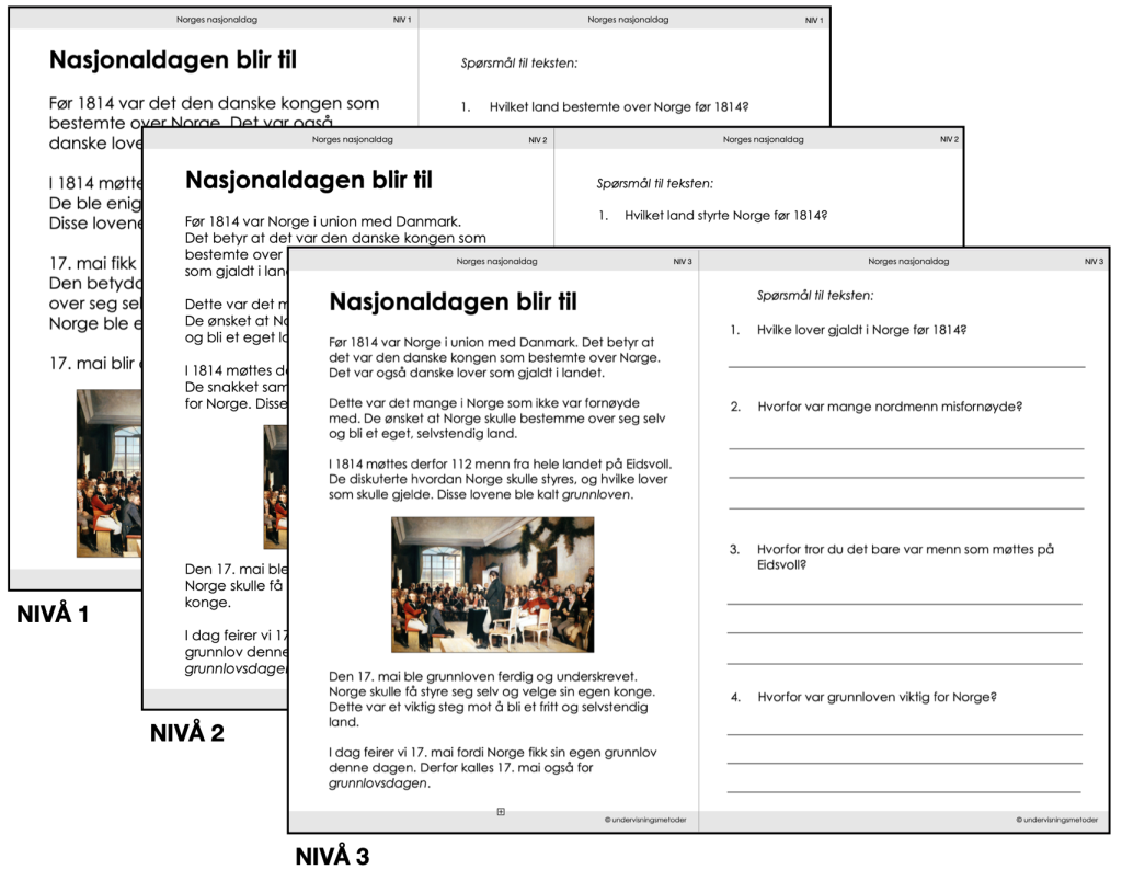 Nivådelte lesetekster med spørsmål, 3 nivå