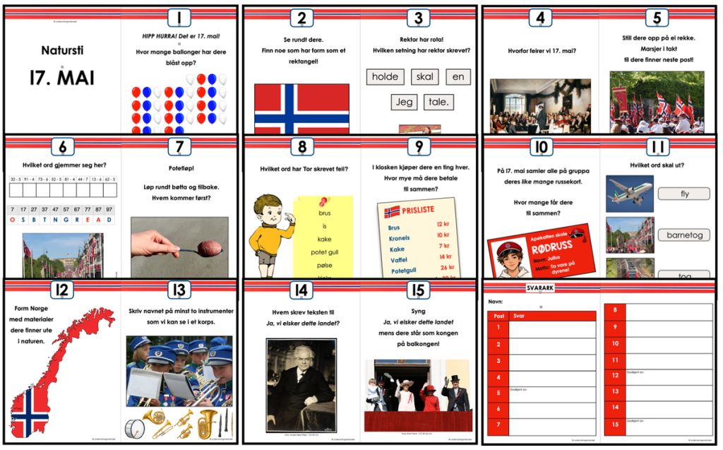Siden 17. mai handler om fellesskap, glede og feiring, gjenspeiles dette også i oppgavene. Flere av postene inneholder praktiske aktiviteter der elevene må samarbeide: