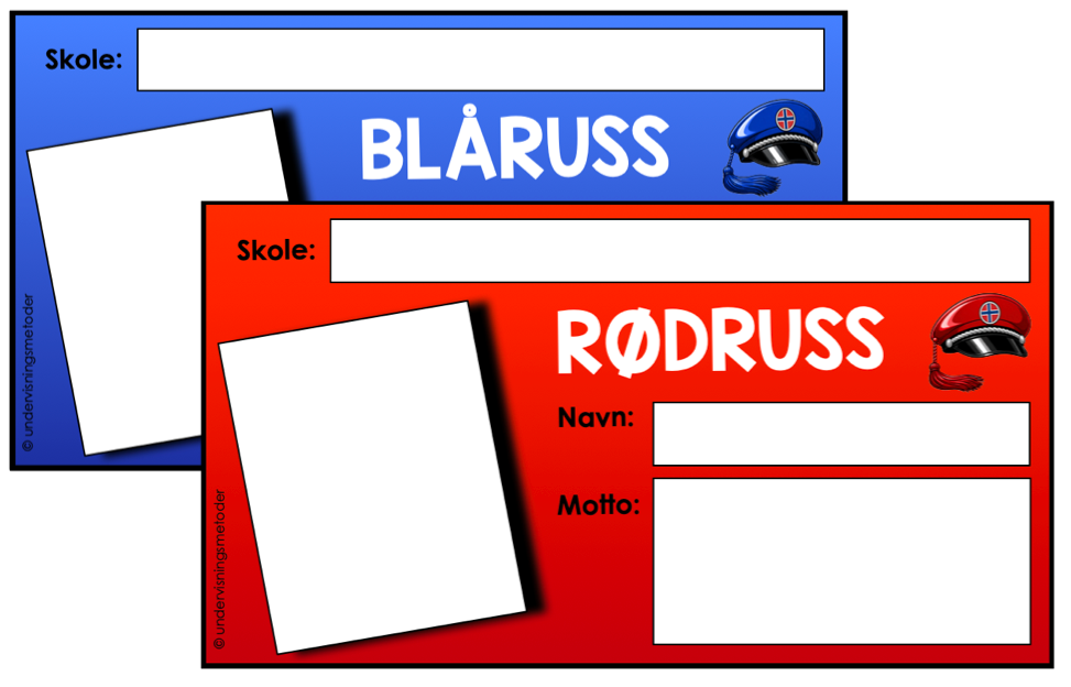 Du kan også laste ned russekort og la elevene få lage sine egne. La elevene få velge om de vil være rødruss eller blåruss. På russekortet tegner elevene et bilde av seg selv, skriver navnet på skolen og et motto. Russekortene blir ekstra fine om de lamineres.