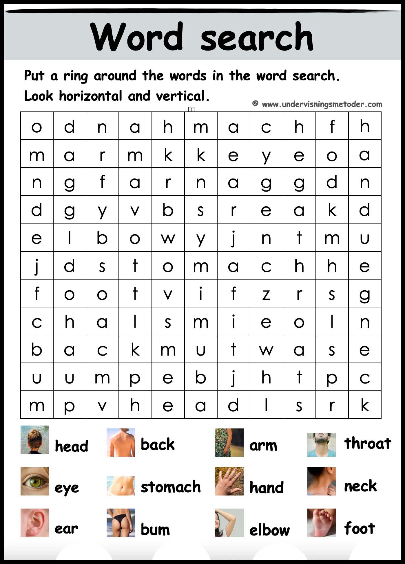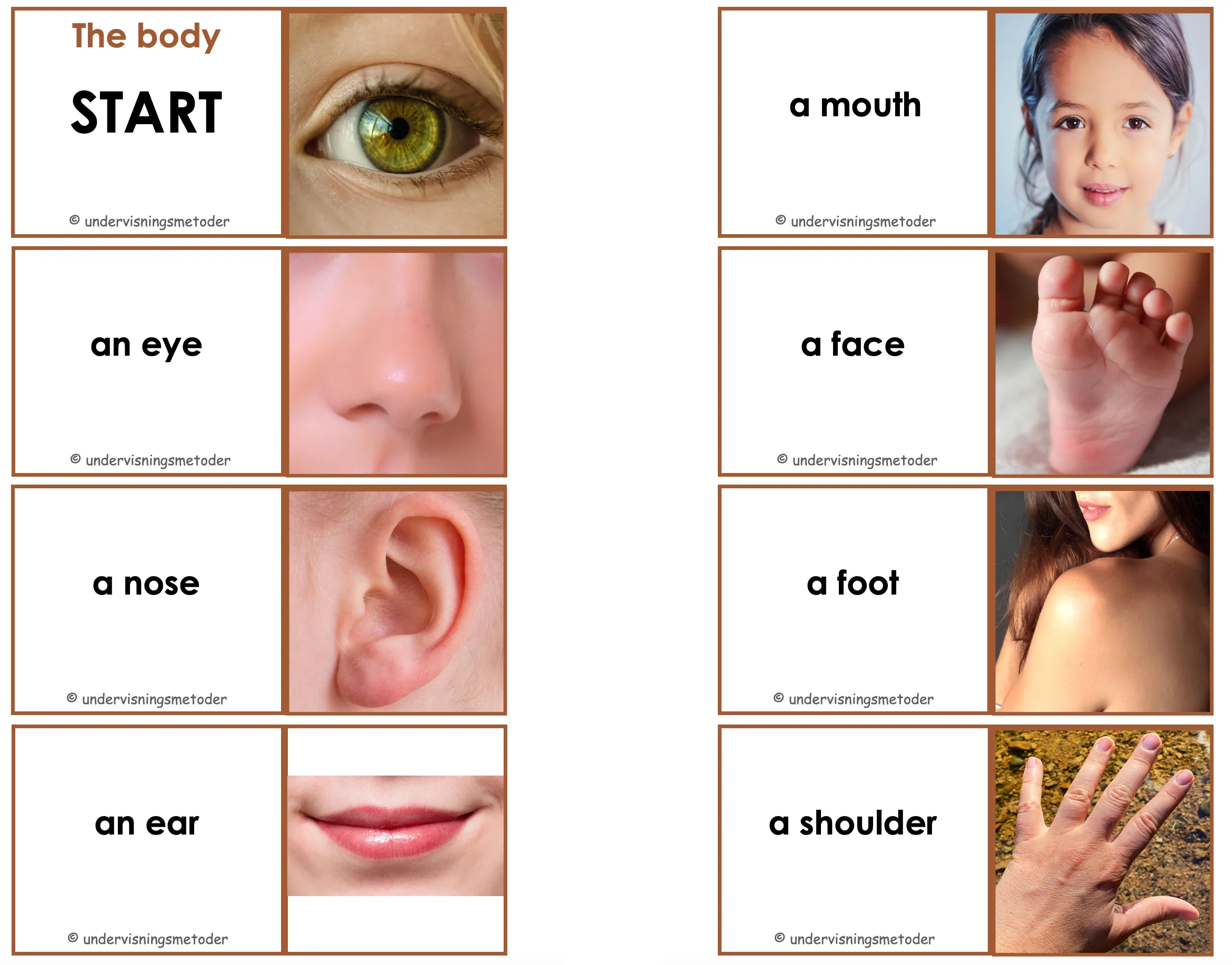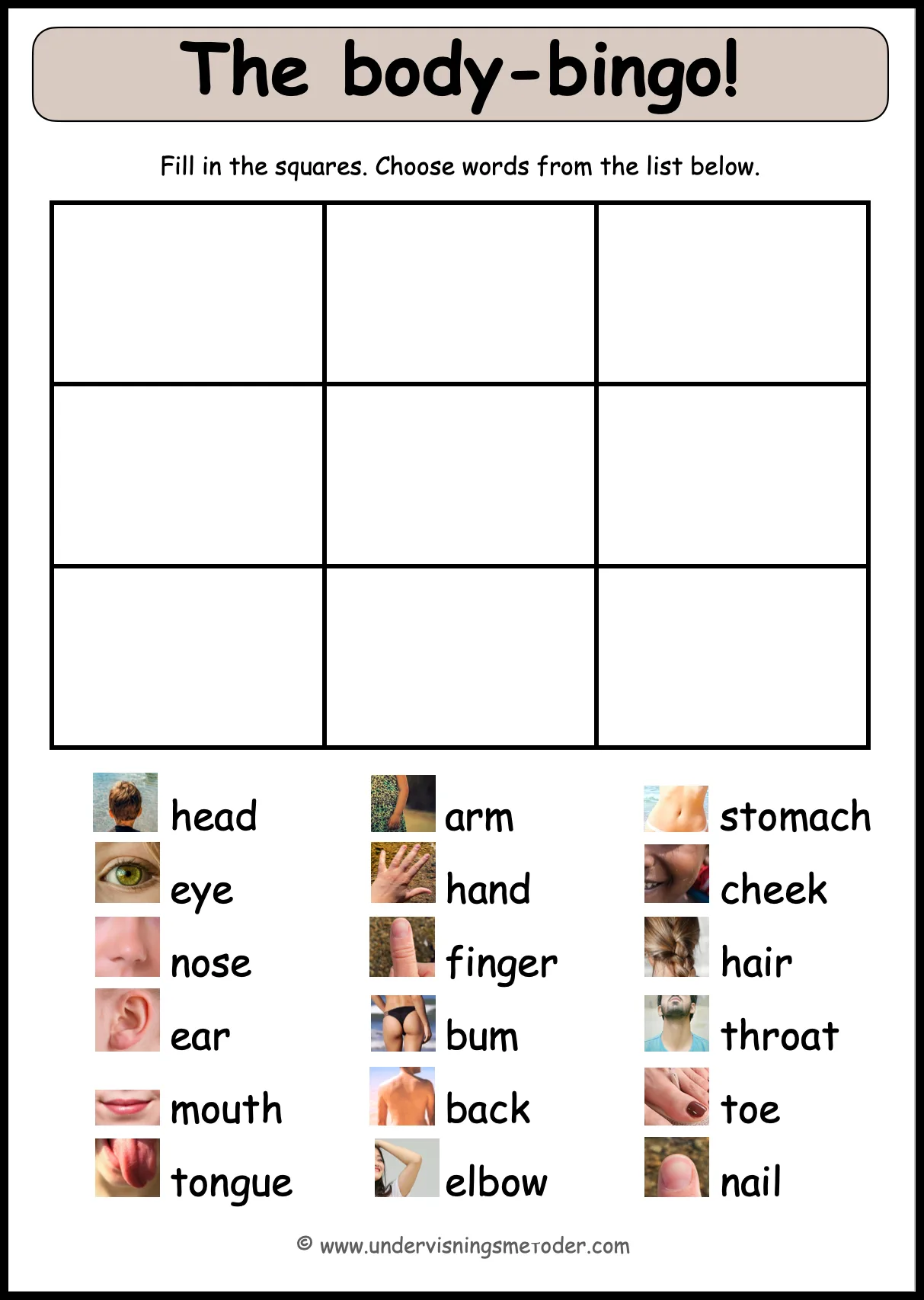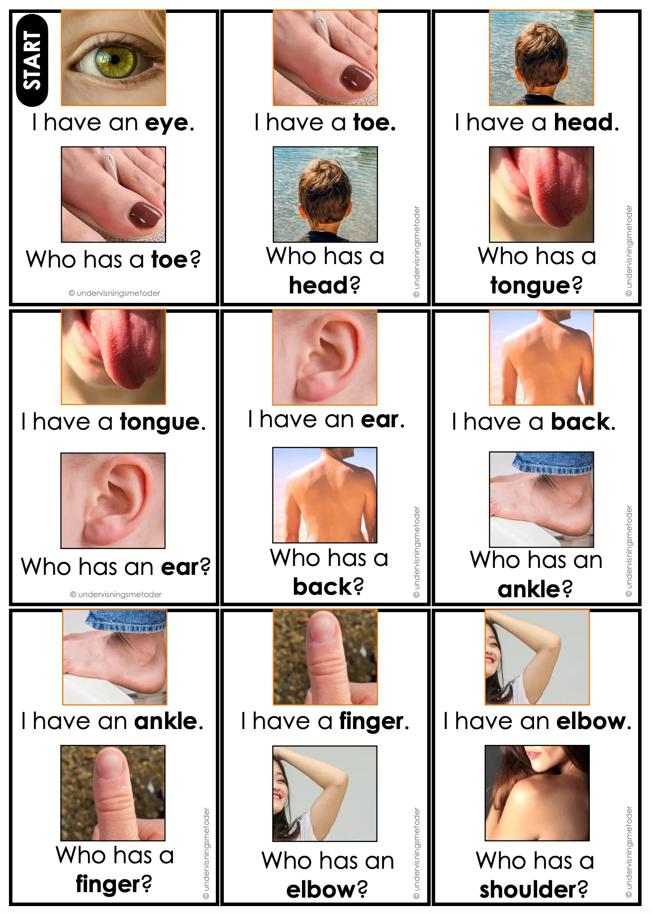 Stå i ring. Læreren eller en av elevene trekker en lapp, for så å lese ordet på lappen. De andre skal peke på den kroppsdelen så fort de klarer.