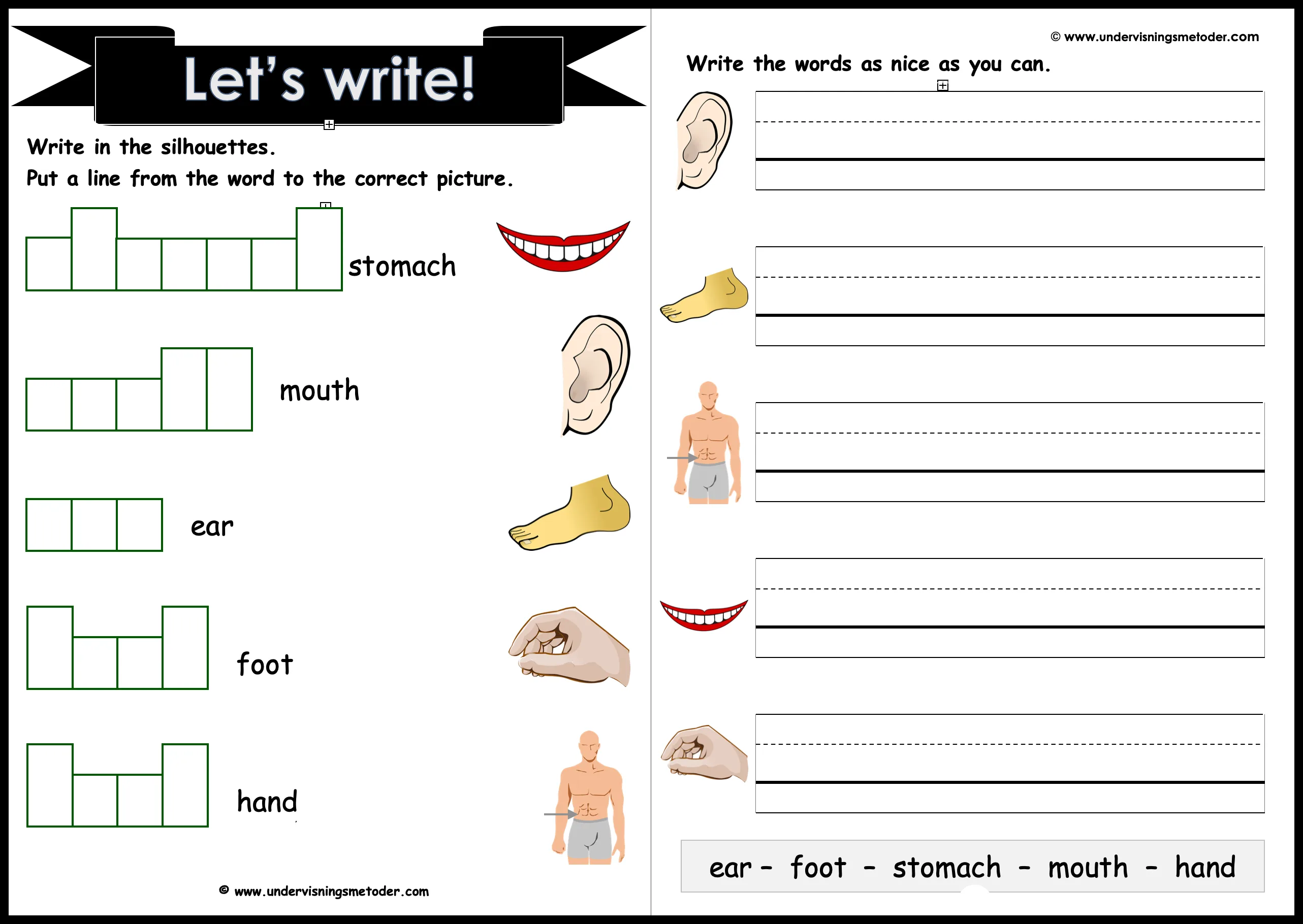 Aktivitet til samling: En elev legger seg på ryggen ned på gulvet. Sprik med armer og bein! Lappene legges ved siden av med tekstsiden vendt ned. En og en elev får komme frem, trekke en lapp, lese ordet på lappen, for deretter å legge lappen på (eller eventuelt ved siden av) riktig kroppsdel på eleven som ligger på gulvet. Hvis eleven trenger hjelp kan de andre hjelpe underveis.