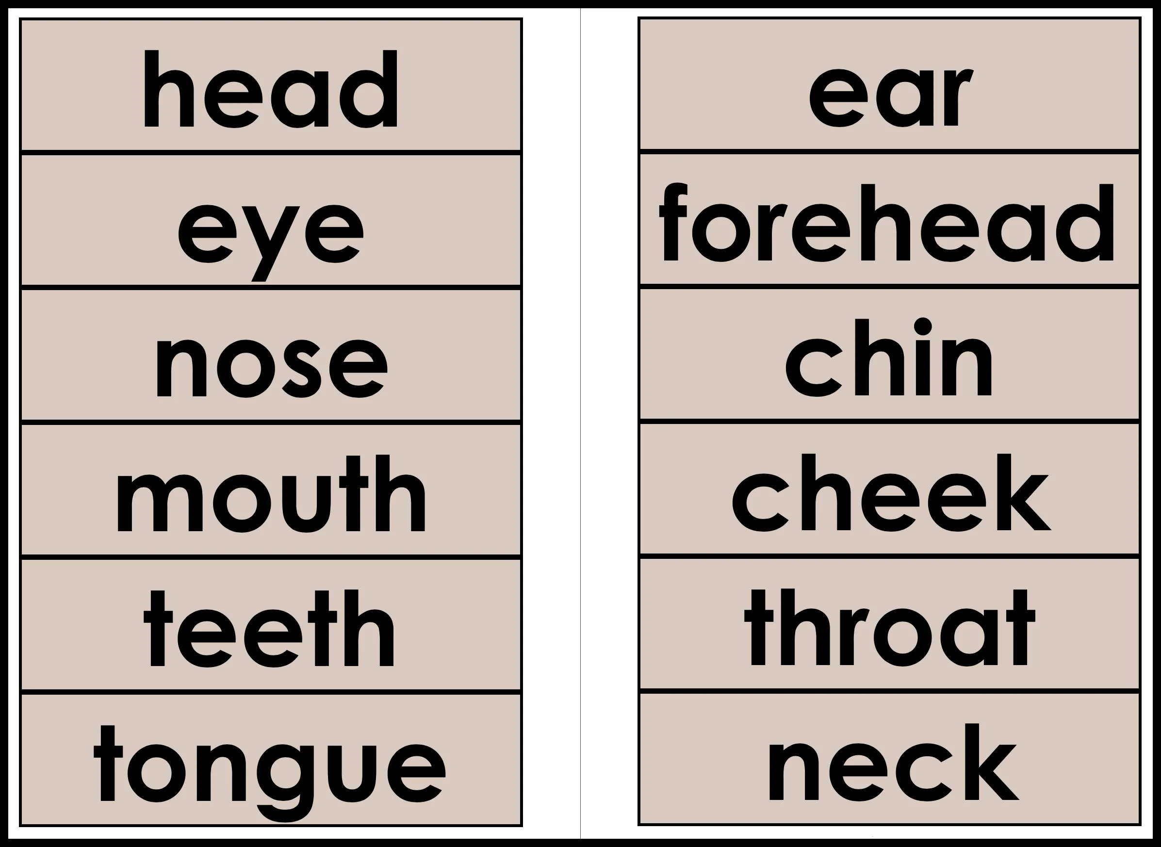 Head: face, eye, nose, mouth, tooth, tongue, ear, forehead, chin, cheek, throat, neck, hair