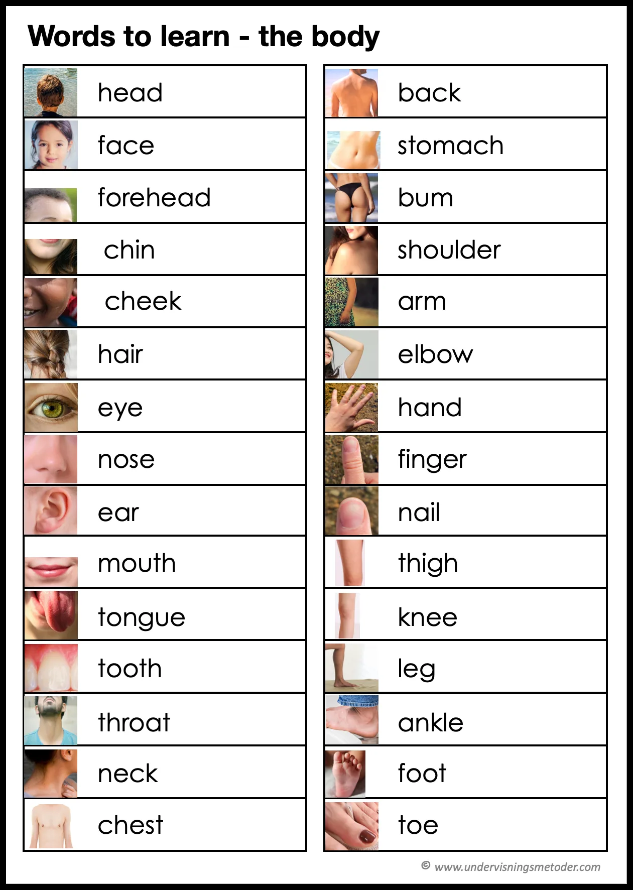 Sitt i en ring. La en elev få komme fram og peke på en kroppsdel. Den som først rekker opp hånda og klarer å si ordet riktig på engelsk, får være den neste til å komme fram. Slik fortsetter det.