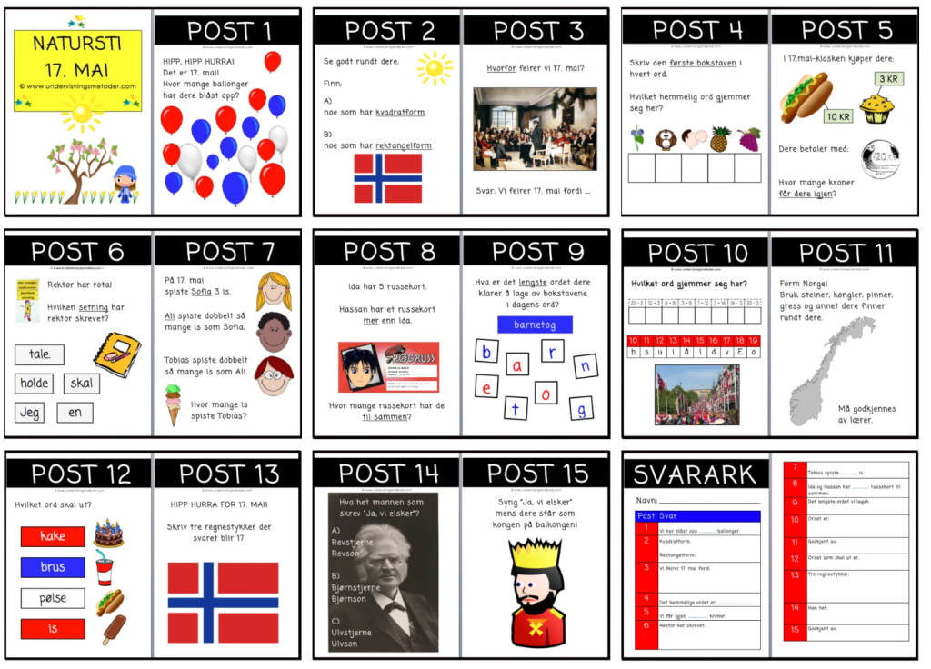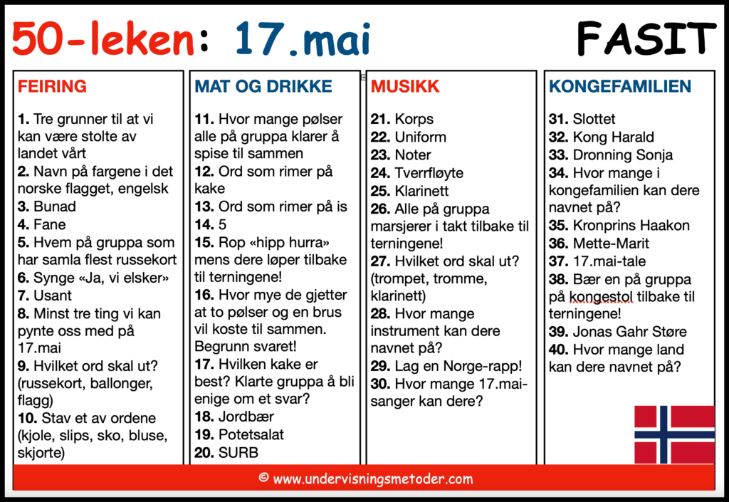 Om du vil ha 30-leken bruker du kun de 30 første oppgavene, eventuelt de to siste arkene som du kan bruke til å lage selv. Om du vil ha 40-leken bruker du de 40 første oppgavene, og om du vil ha 50-leken bruker du alle oppgavene. Jeg har laget oppgavesettet slik at vanskegraden øker etter oppgave 30. Oppgavene har jeg delt opp i 5 kategorier: feiring, mat og drikke, musikk, kongefamilien og historie. Bakerst i oppgavesettet har jeg laget to oppgavesider som du selv kan bruke til å lage egne oppgaver dersom du ønsker å bytte ut noen oppgaver slik at det passer til dine elever.