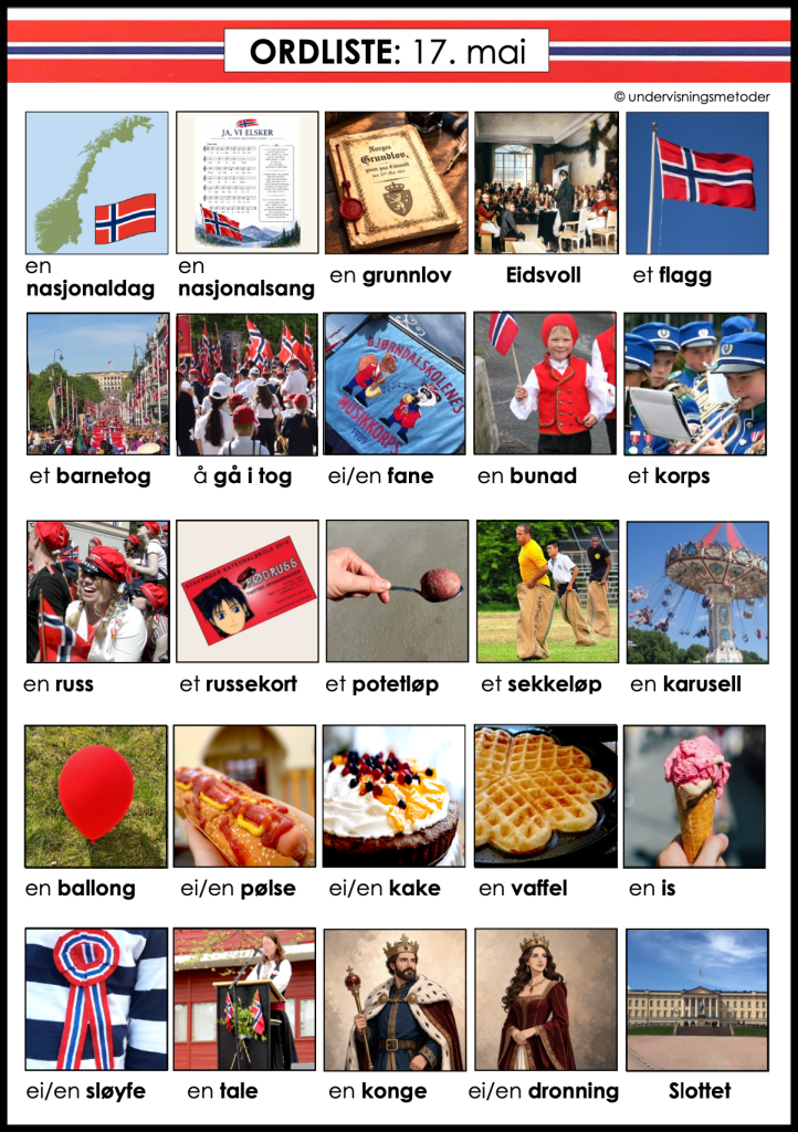 * Legg lappene med 17.mai-ord (bør være laminerte) utover på en benk midt i klasserommet, eller eventuelt et annet passende sted. Ordene bør være vendt opp.