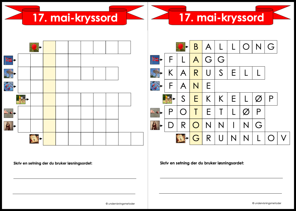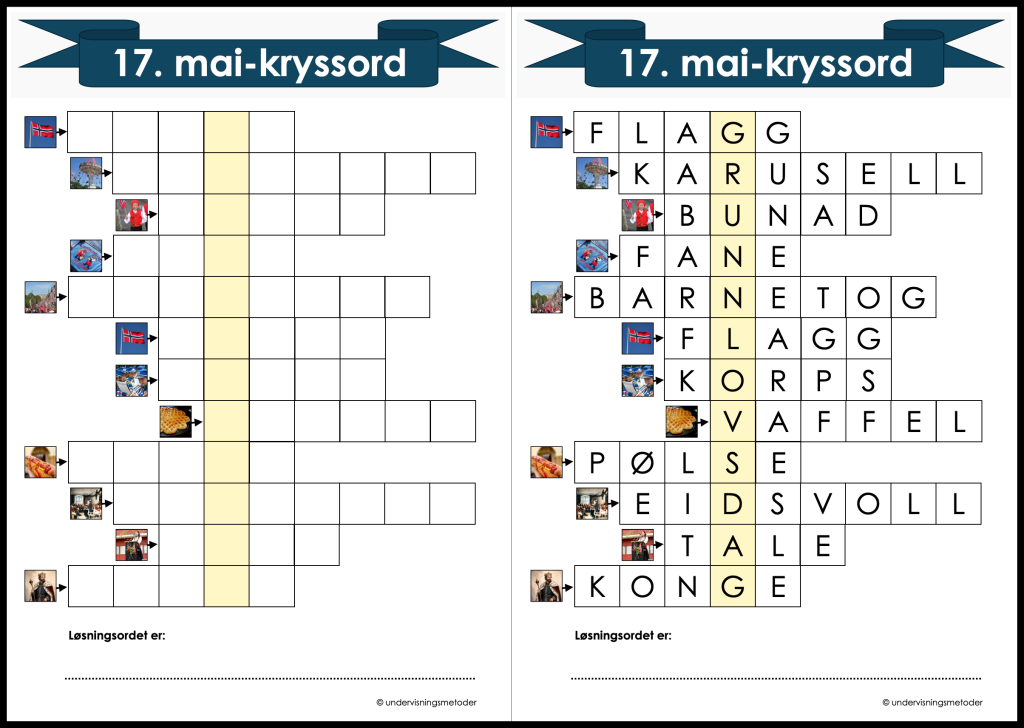 To 17.mai-kryssord med fasit, ordforråd/staving