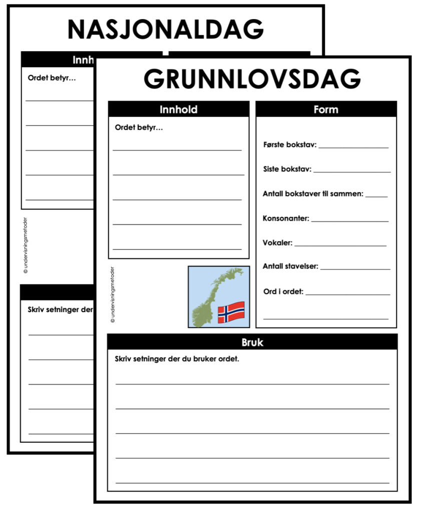 Disse to arbeidsarkene går direkte på begrepslæring, hvor elevene får jobbe med ordets innhold, form og bruk.