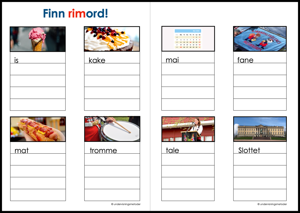 Kommentar: På den siste oppgaven på det andre arbeidsarket skal elevene finne rimord til ordet Slottet. Siden dette er et ord som har o for å-lyd og endelsen -et, kan dette by på utfordringer. Denne oppgaven er en god anledning til å lære elevene at det er lyden som teller for å finne ut om ord rimer, ikke hvordan ordet skrives. Forklaringen er at to ord rimer når de har lik lyd fra den siste trykksterke vokalen og ut resten av ordet.