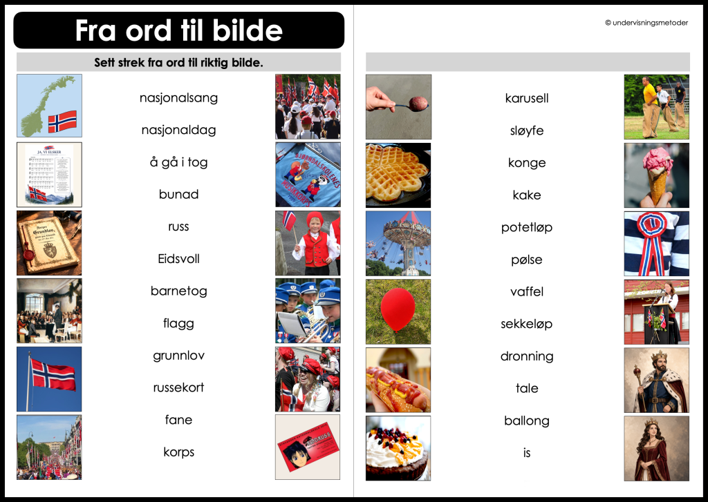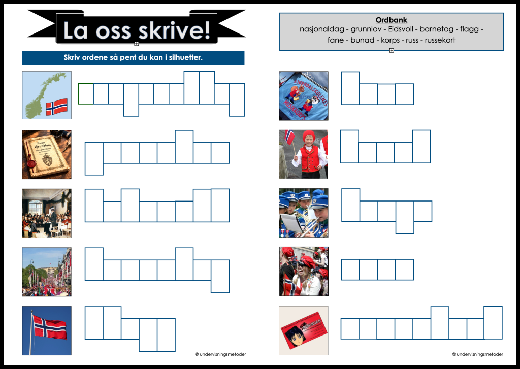 I etterkant av aktiviteten kan lappene med 17.mai-ord brukes til for eksempel alias, lapp i panne, og trekke et ord som elevene skriver setninger med.