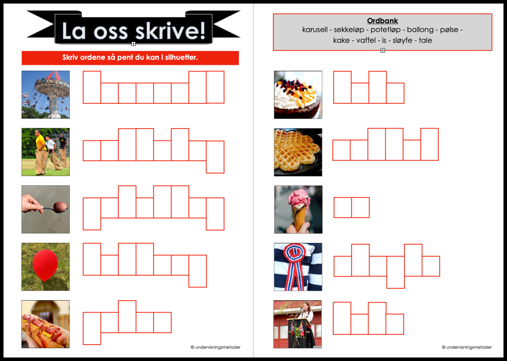 • Du kan velge å lage en løype eller to løyper for å nivådifferensiere. Den ene løypen kan være bildekortene med ordet under slik kortene er. Den andre løypen kan være bare bildene (klipp bort boksen med ordet under bildet). Det krever mer å skrive ordet uten skrivestøtte.