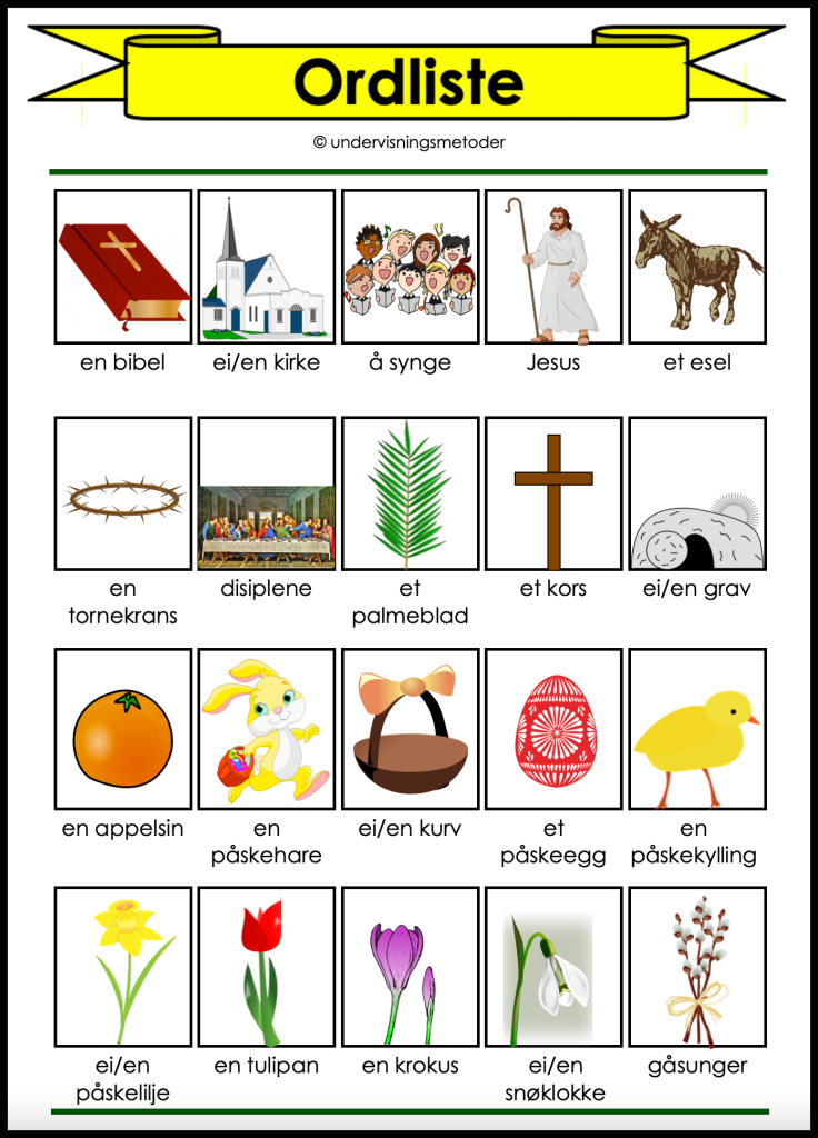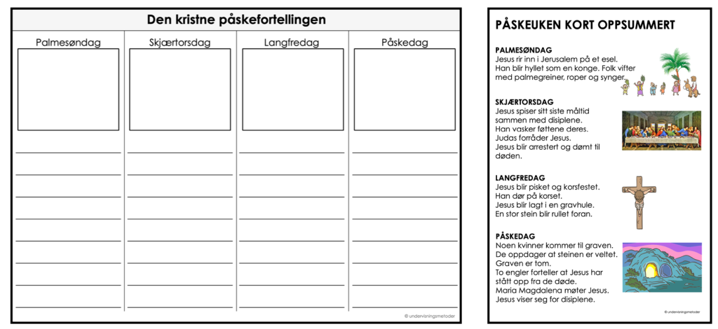 Arbeidsarket “Den kristne påskefortellingen” kan brukes som utgangspunkt til å øve på å gjenfortelle historien. Oversikten med tegningene til hver helligdag er fine til å bruke som utgangspunkt for gjenfortelling.