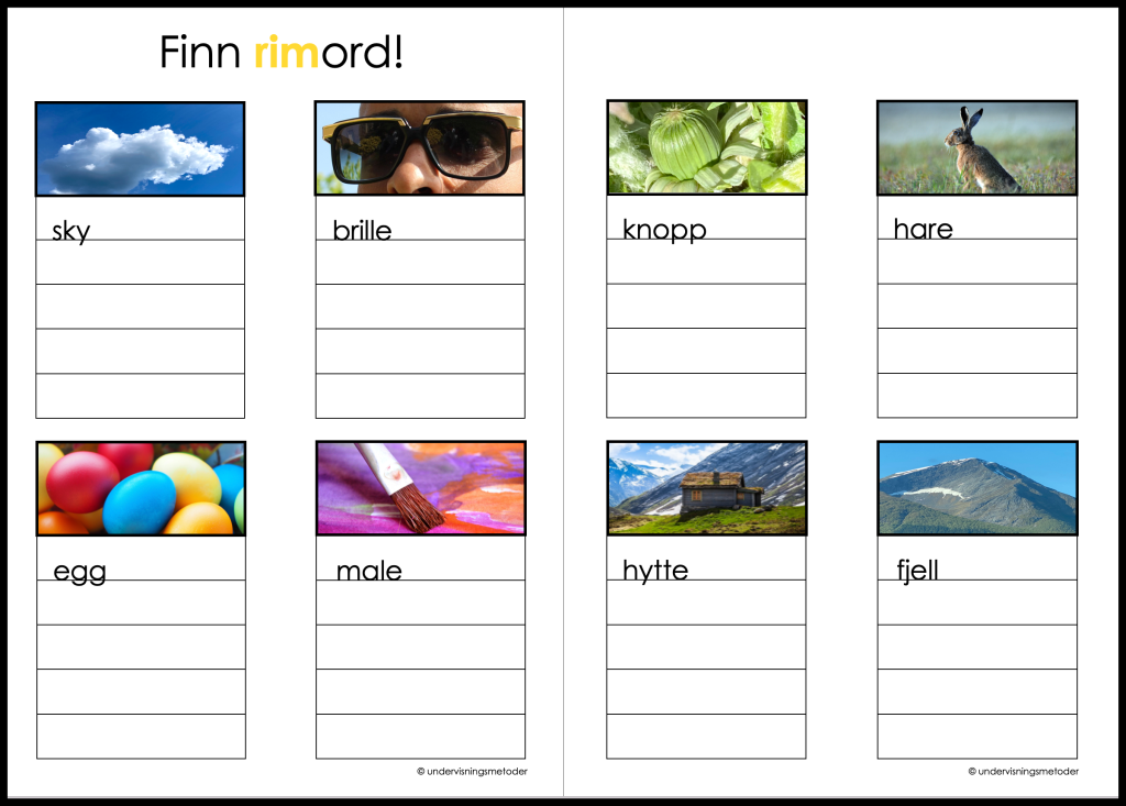 2) Skriv setninger med ordene: Her kan elevene også klippe ut et bilde, lime bildet i skriveboka si, for så å skrive en setning med ordet ved siden av.
