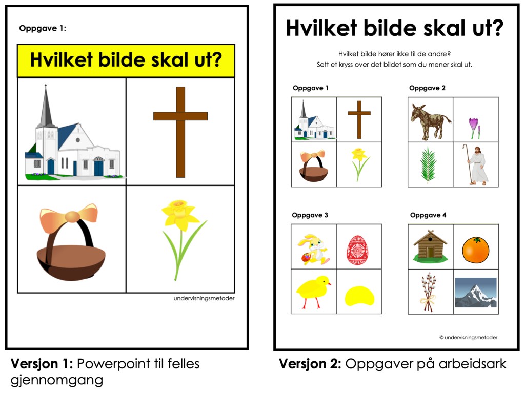 - OPPGAVE 1: FØRSTELYD – kirke, kors, kurv, påskelilje – påskelilje skal ut, fordi det er det eneste ordet som ikke begynner på k