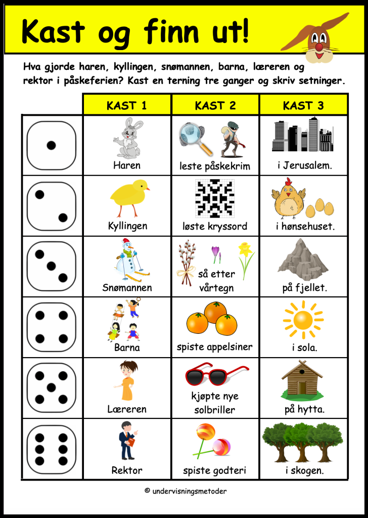 Kast flere terninger samtidig. Klarer du å bli et hoppende egg? Eller hva med en skigående påskelilje?