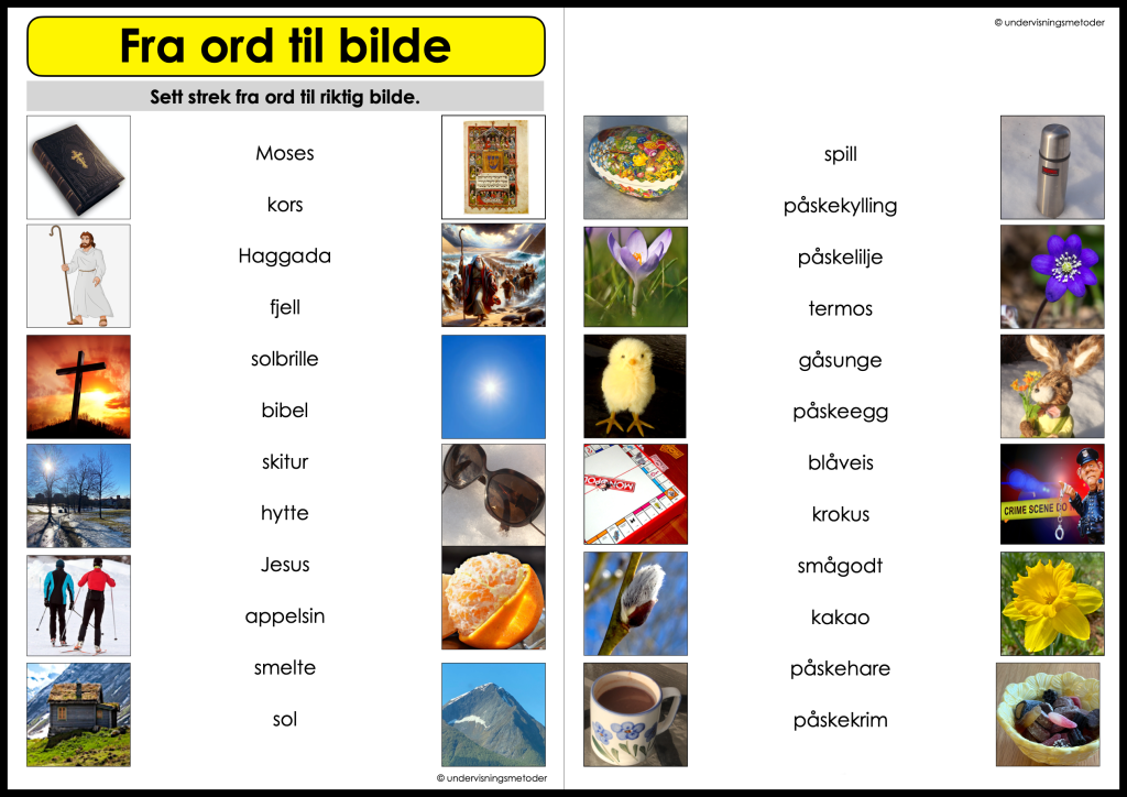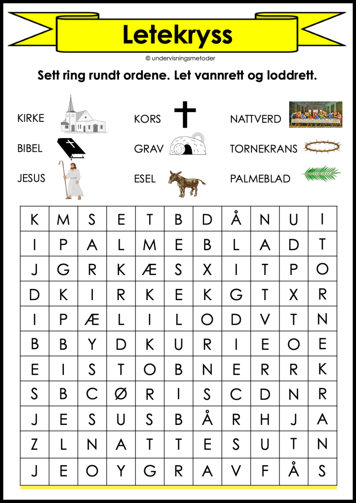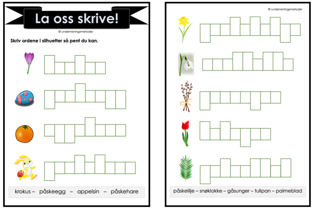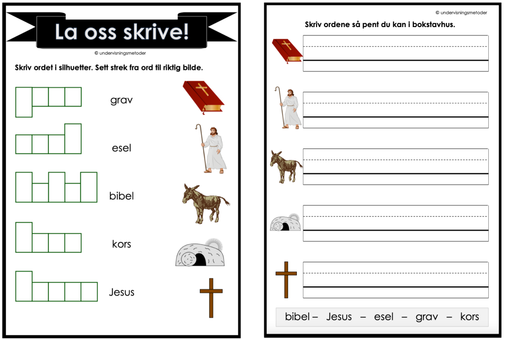 På arket “Påskeuken kort oppsummert” står en kort oppsummering over hva som skjedde hver av helligdagene i påsken. Disse tekstene kan være til støtte for elevene når de skal skrive selv. Noen klarer å skrive fritt, mens andre kan ha god nytte av avskrift. Begge deler er greit!