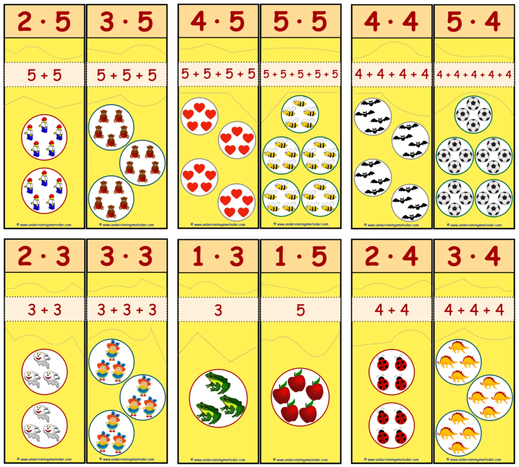 Til hvert multiplikasjonsstykke er det tre brikker. En brikke der elevene forøve seg på å lese multiplikasjonsstykket, en brikke med multiplikasjonsstykket skrevet som gjentatt addisjon og en tredje brikke der multiplikasjonsstykket er visualisert med grupper, som igjen kan kobles til gjentatt addisjon.