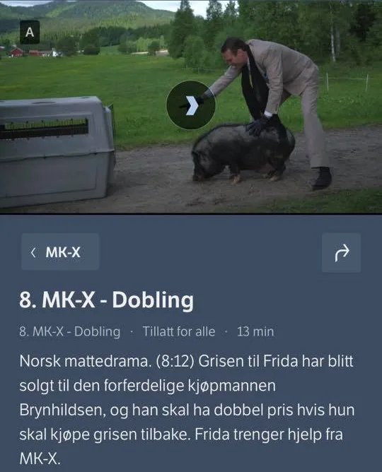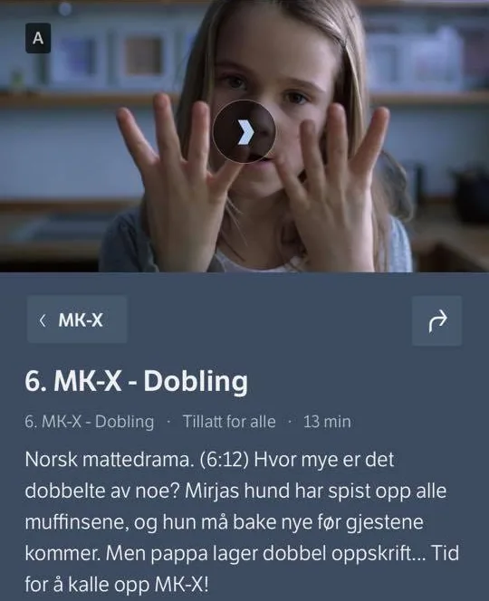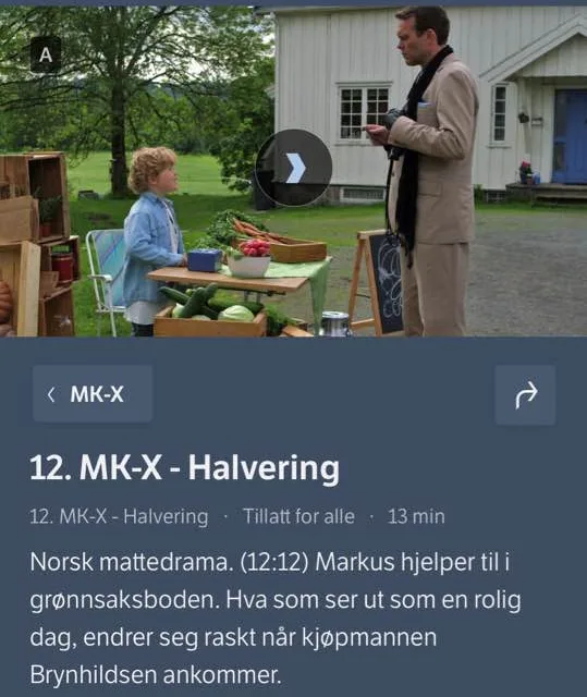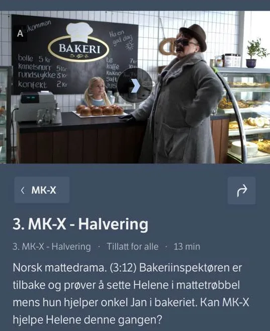 1. MK_X – Halvering (3:12): https://tv.nrk.no/serie/mk-x/sesong/1/episode/3/avspiller