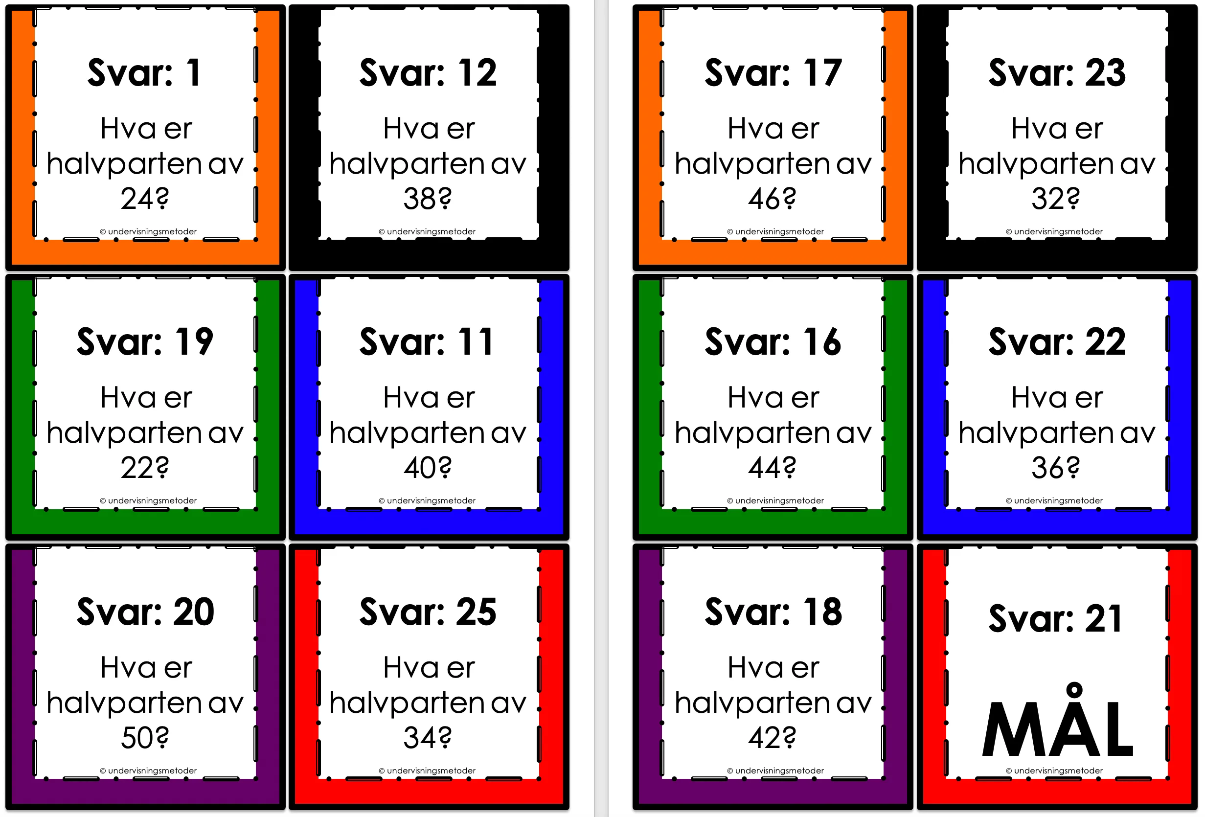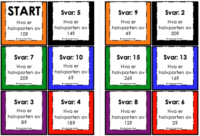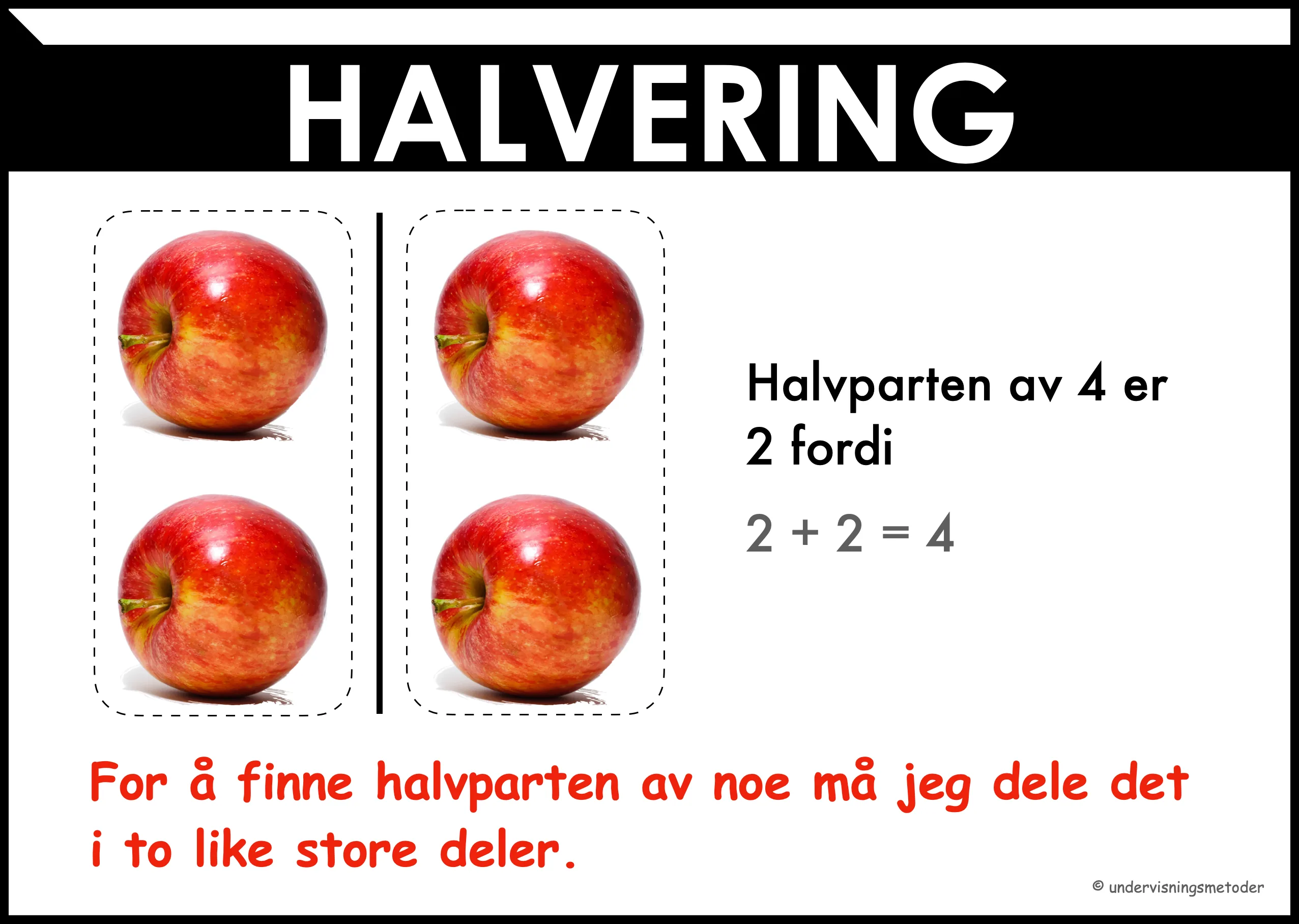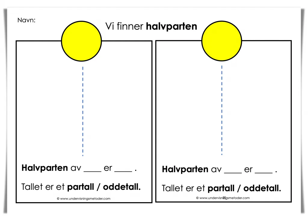 For å finne halvparten av noe må du dele det i to like store deler.