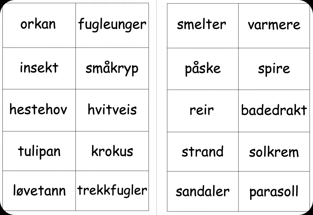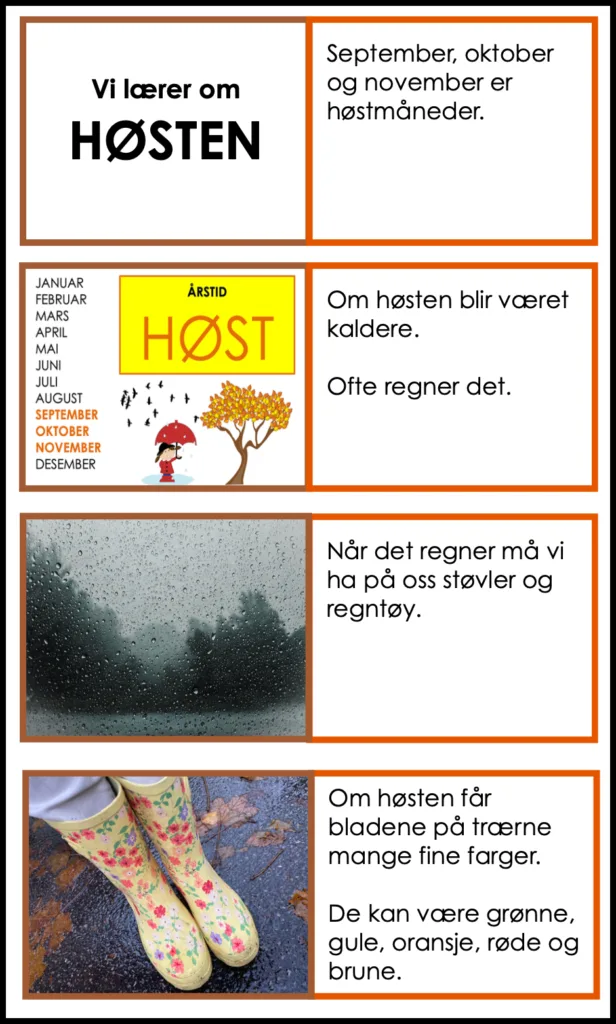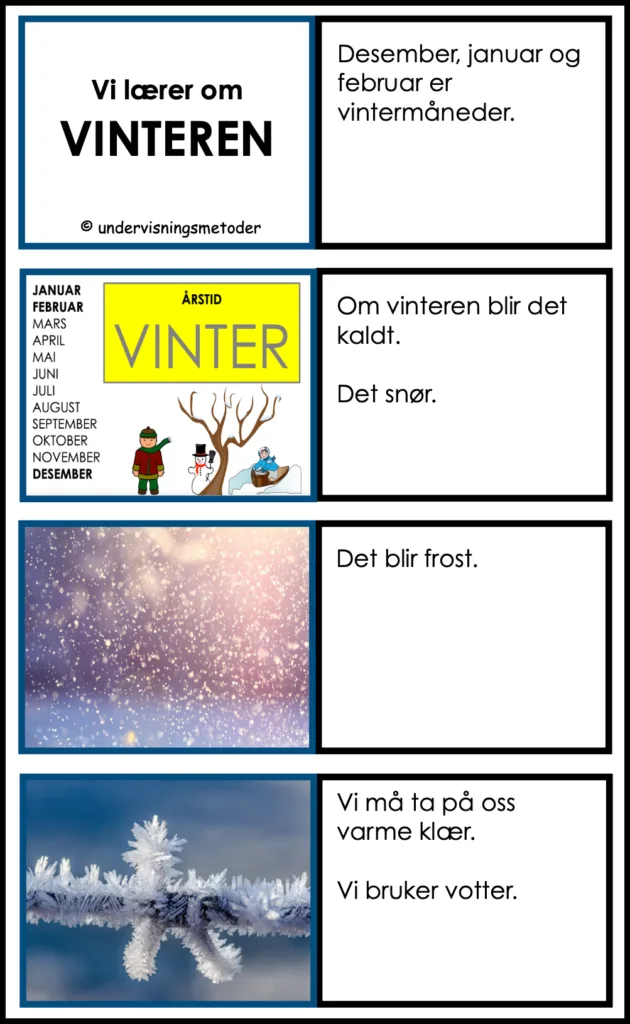 Her får elevene god øving i leseforståelse. Tekstene består av korte setninger, og tar for seg viktige ord og begreper knyttet til hver av årstidene.