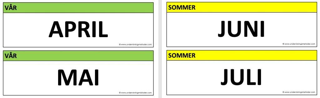 Her er fire ulike dominoer med lesetekster, – en domino til hver av årstidene: vår, sommer, høst og vinter.