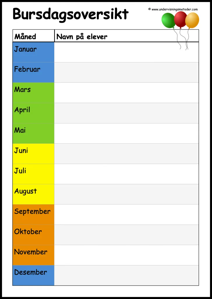 Del ut et ark og gjerne et skrivebrett om du har, til hver elev. Elevene får i oppdrag å vandre rundt i klasserommet og spørre klassevennene sine: “Når har du bursdag?”. Klassevennene svarer med full setning: “Jeg har bursdag 23. mars”, for så å stille spørsmålet tilbake: “Når har du bursdag?”. Stopp tiden når du ser at elevene begynner å bli ferdige.