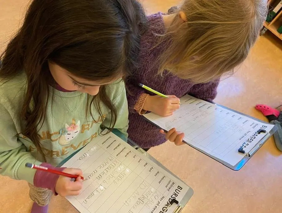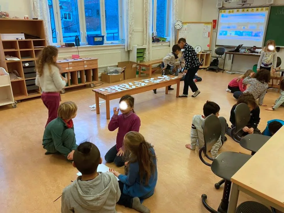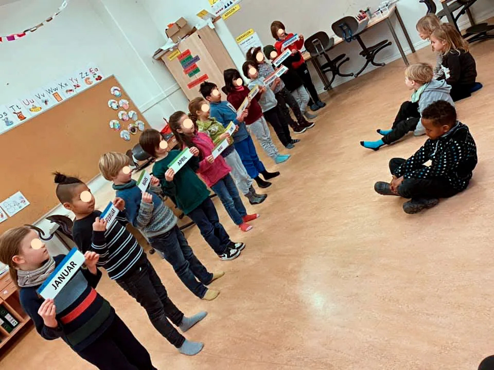 Til slutt fant vi ut hvor mange elever i klassen som har bursdag om våren, om vinteren, om sommeren og om høsten. Denne aktiviteten kan gjørs både inne og ute. Kanskje kan det henge en bursdagsoversikt på veggen i klasserommet? Eller på døra inn til klasserommet, slik at elevene kan lese på den når de ønsker?
