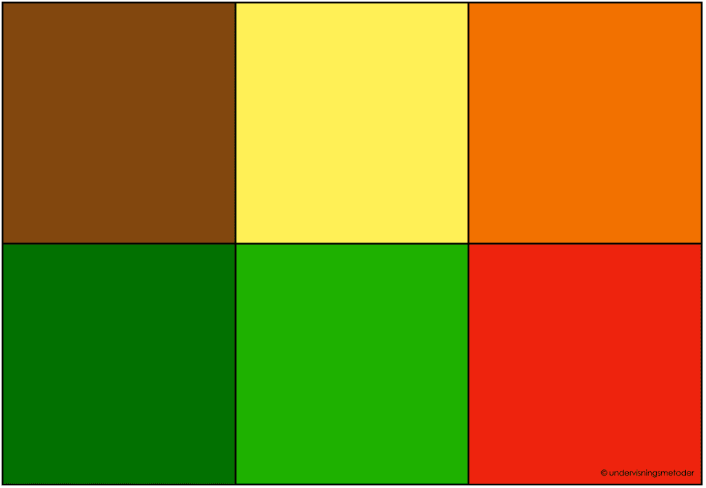 La elevene jobbe i læringspar, eventuelt i små grupper på 3-4. Hvert par/gruppe får utdelt en laminert plansje med høstfargene. Snakk om høstfargene på norsk, deretter på engelsk og gjerne på flere språk om du har elever fra andre land i klassen din.