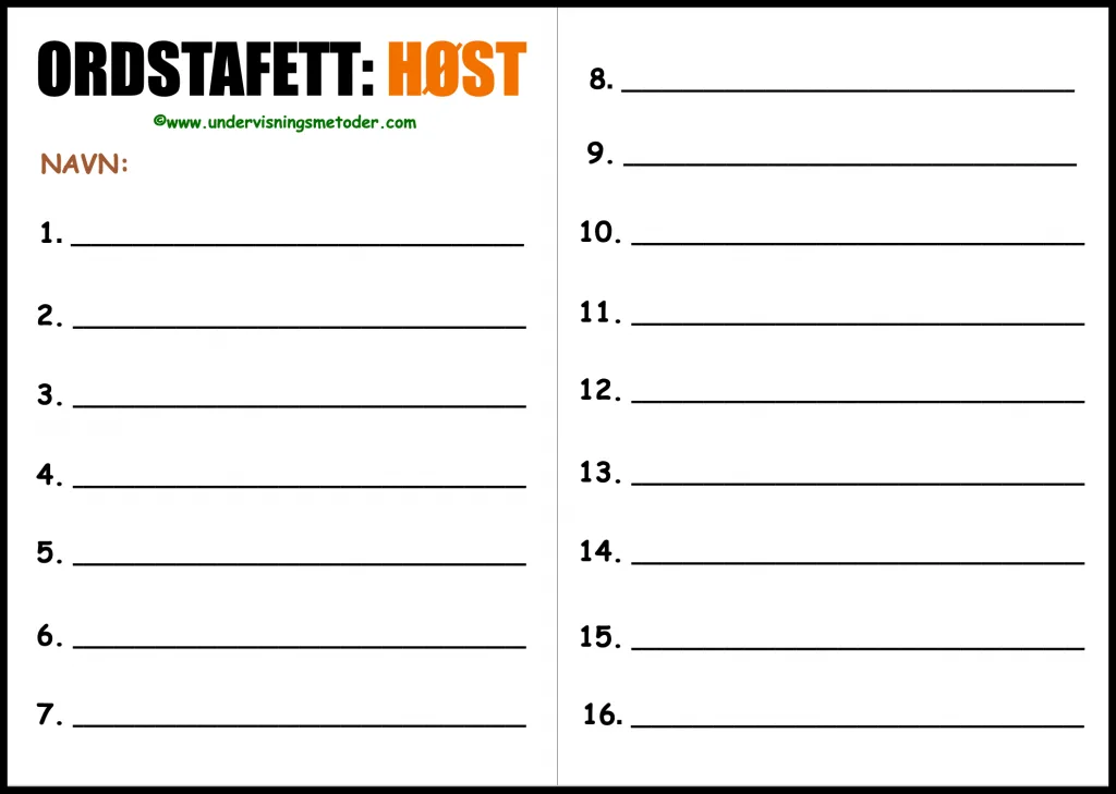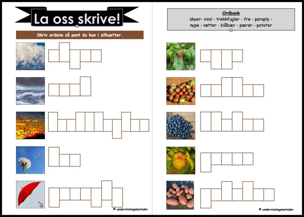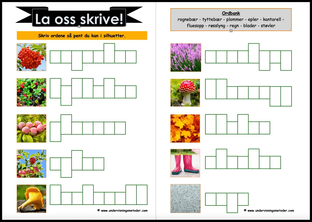 Jeg kaller den ordstafett, men bruker den som en aktivitet elevene gjør to og to. Slik får de bedre tid på seg til å lese og skrive ordene riktig. Arkene med høst-ordene må skrives ut i A3-format.