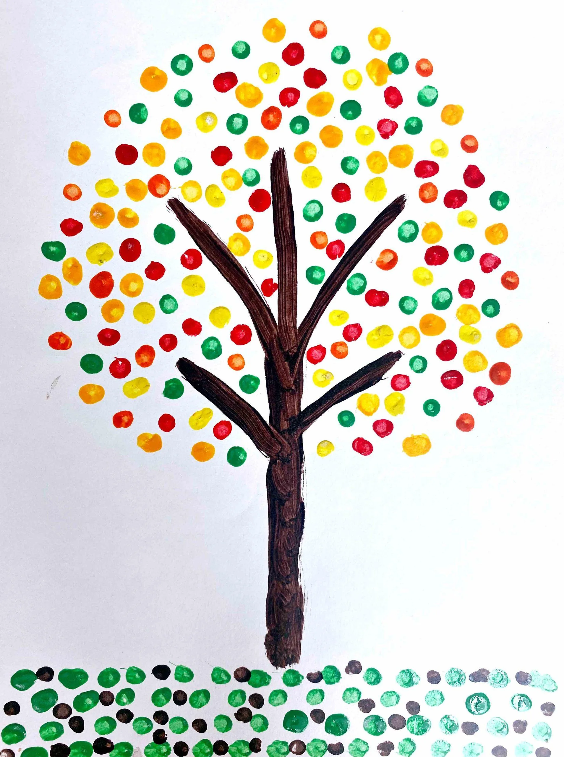 Start med å male stammen. Mal deretter bladene og bakken ved å ta maling på bommullspinnen, for så å trykke bomullspinnen mot arket.