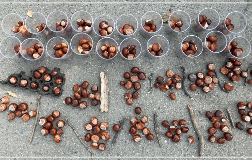 Del ut glass til hver av gruppene. I hvert glass skal det være 10 kastanjenøtter. Hvor mange kastanjenøtter klarer dere å finne? Hvordan er det lurt å telle? Hvis dere klarer å finne over 100: hvordan er det lurt å gruppere glassene for å gjøre det lettest mulig å telle og ha oevrsikt over hvor mange kastanjenøtter dere har funnet?