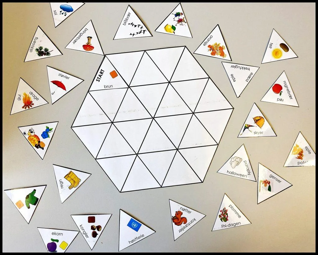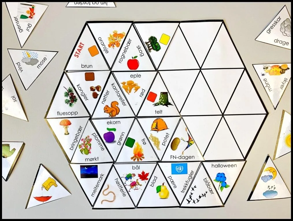 - Legg brikkene uover bordet med illustrasjonene og ordene vendt opp.