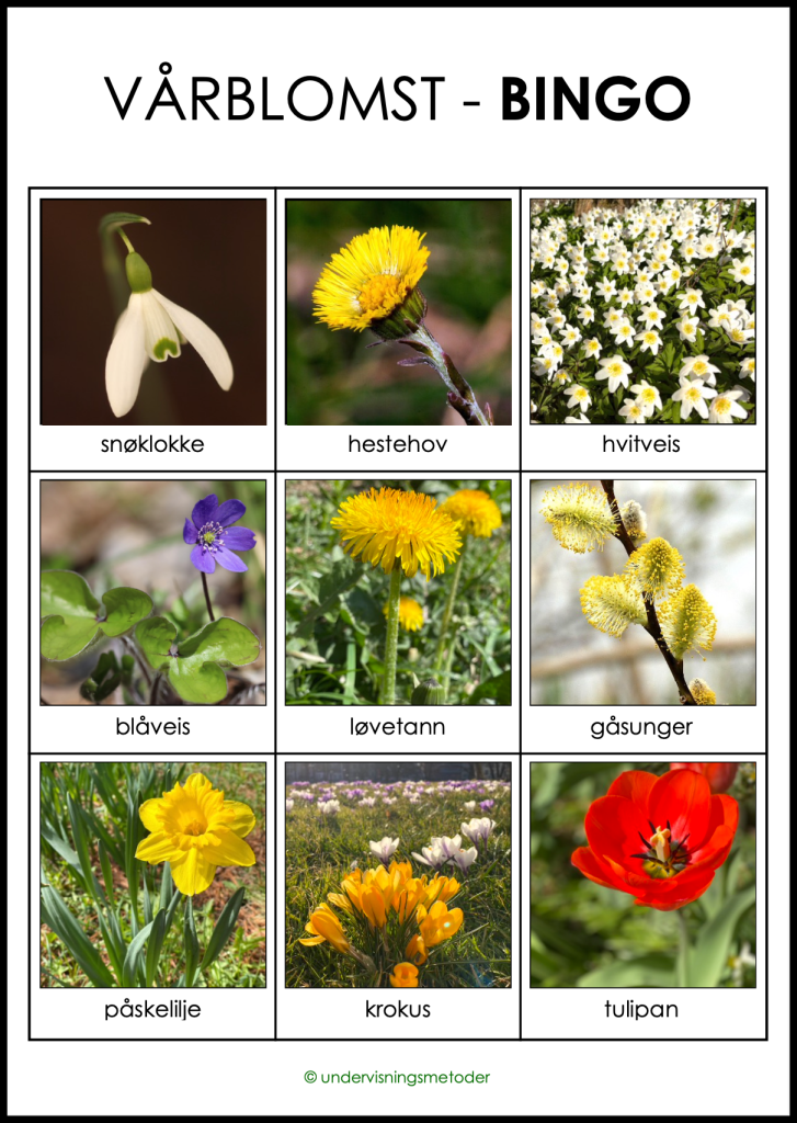 hestehov, snøklokke, blåveis, hvitveis, løvetann, gåsunger/selje, krokus, tulipan, påskelilje