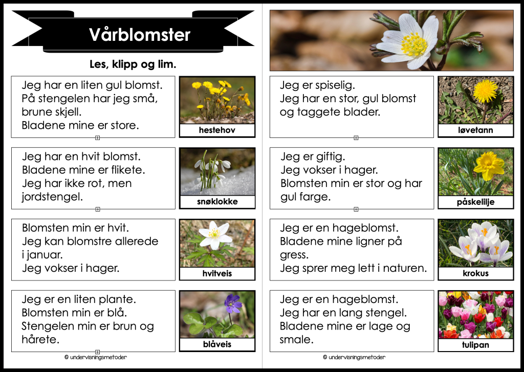 “Les, klipp og lim – Vårblomster” er en leseforståelse-oppgave der elevene først leser teksten, deretter klipper de ut bildene, for så å lime bildene ved riktig tekst.