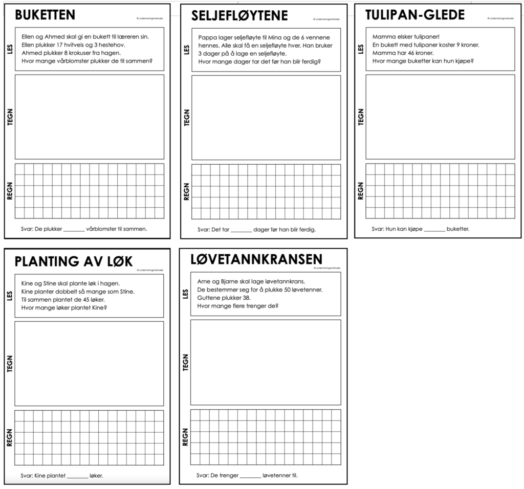 Les, tegn og regn! er en serie med arbeidsark til å øve på strategier for å løse tekstoppgaver som jeg laget for flere år siden. Her er målet at elevene skal lære å lese oppgaveteksten nøye og bruke tegning som regneverktøy. De skal også lære å snakke matematikk – forklare hvordan de tenker.