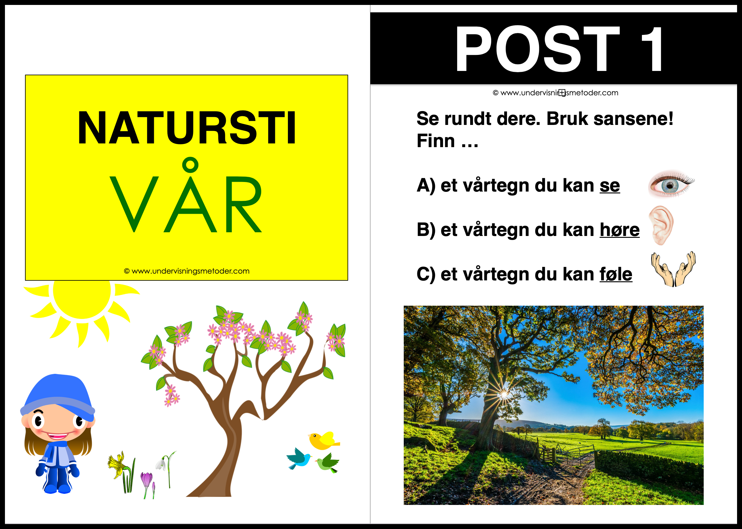Postene har en tverrfaglig tilnærming til temaet “Årstiden vår”. Naturstien inneholder oppgaver hentet fra fagene naturfag, norsk, matematikk og musikk. Naturstien inneholder også mange fargerike fotografier som skal vekke fascinasjon, nysgjerrighet og interesse.