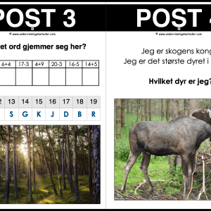 Når dere har kommet frem til destinasjonsstedet, fordeler dere postene på de voksne, slik at dere henger opp noen poster hver. Kanskje kan dere også gi ansvar til noen av elevene for å henge opp noen poster også. Jo lengre avstand dere har mellom postene, jo mer fysisk aktivitet vil elevene få under gjennomføringen. Velger dere å plassere postene hulter til bulter, og ikke i rekkefølge, vil det også føre til mer fysisk aktivitet. Finn gjerne noen lure steder som krever at elevene må lete litt.
