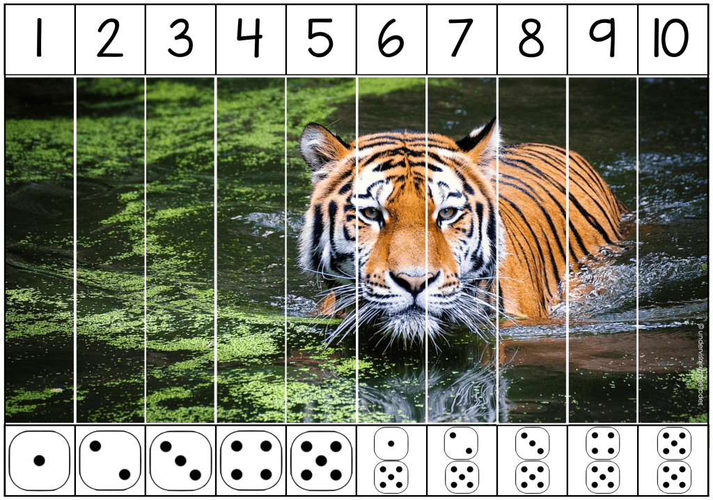 Klipp langs linjene slik at hver brikke inneholder et tall, en del med tallord/tellestreker/terninger/regnestykker og en del av bildet.