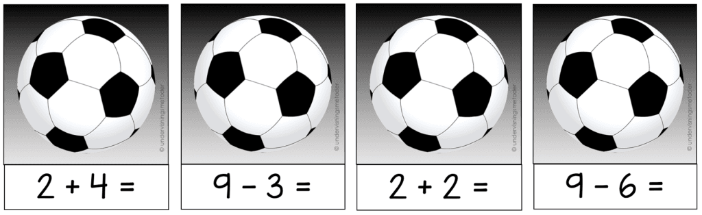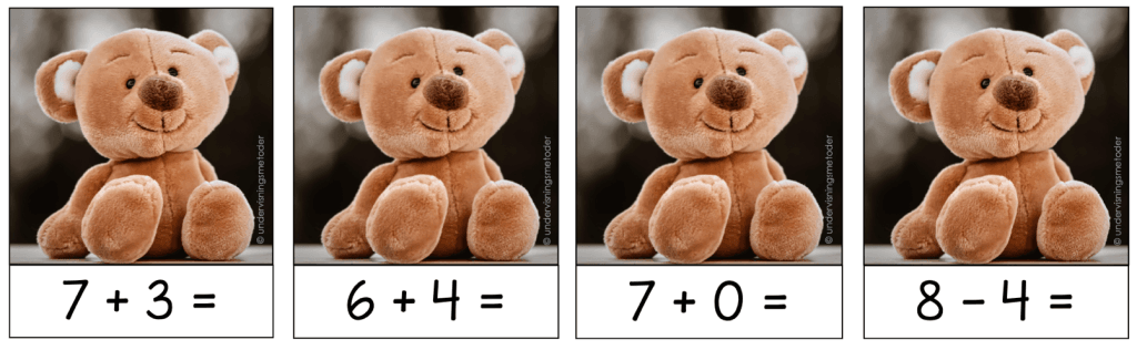 -Stasjonsundervisning: Legg regnestykkene utover bordet med regnestykkene vendt ned mot pulten. Elevene trekker et og et regnestykke, skriver det i boka si og bruker konkretiseringsmateriell til å finne svaret. Elevene jobber sammen med læringspartner.