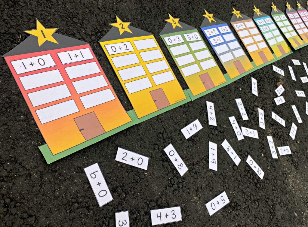 Ute/inne: La elevene få starte med å sortere tallhusene i stigende rekkefølge. Legg kortene med regnestykker utover gulvet like ved, eller utover bakken dersom dere gjennomfører aktiviteten ute. Bruk gjerne en rockering eller lignende som du legger kortene inni. La elevene få hente seg et kort med et regnestykke, for deretter å regne ut svaret og sortere kortet under riktig tall. Jo lengree avstanden er mellom tallkortene og tallhusene, jo mer fysisk aktivitet vil elevene få. Dette gjelder både inne og ute. Denne sorteringsaktiviteten kan være en felles aktivitet for hele klassen, eller en aktivitet på en stasjon som en del av stasjonsundervisningen.